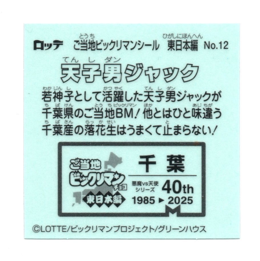 ビックリマン ご当地ビックリマン 東日本編 「天子男ジャック」 No.12 千葉 -||- 魅力あふれる「天子男ジャック」が特別な形で登場する、貴重なビックリマンシールです!その独自のデザインと高品質な仕上がりが、ビックリマンファンやコレクターの心をしっかりと引き付けるアイテムとして際立っています。このシールを手に入れることで、ご当地ビックリマンの世界をさらに深く楽しむことができるでしょう。 -||- あなたのコレクションに特別な価値をプラスする「天子男ジャック」。この商品は、ビックリマンファンやコレクション愛好者にとって非常に魅力的な一品です!特別なビックリマンの魅力を共に体感しながら、新たな興奮を見つけていきましょう! -||- ※商品は丁寧に保管し、湿気や傷にご注意ください。