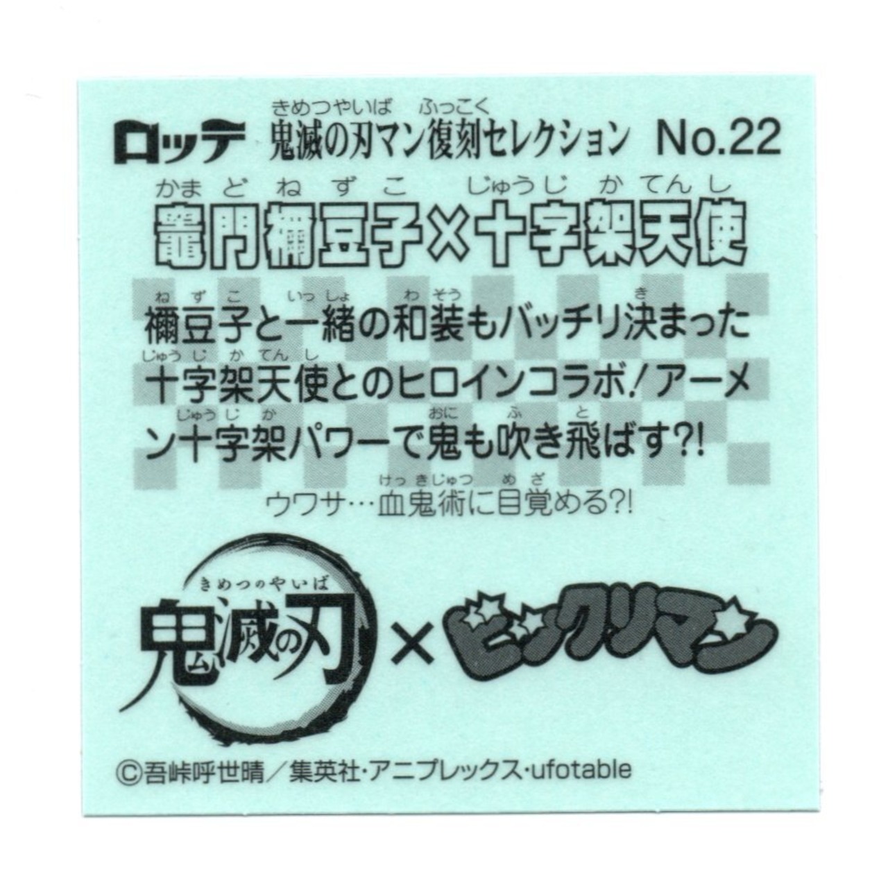 ビックリマンシリーズの復刻セレクション!今回は「竈門禰豆子×十字架天使」が登場です。鬼滅の刃の人気キャラクターとビックリマンのコラボが実現しました。禰豆子の可愛らしさと十字架天使の神秘的なデザインが融合した一枚は、コレクター必見の逸品です。