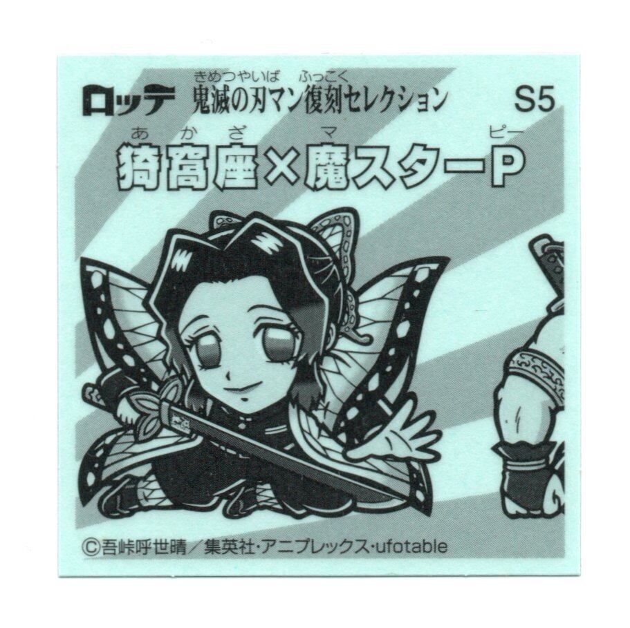 ビックリマン 鬼滅の刃マン 復刻セレクション 「猗窩座×魔スターP」 S5は、待望のコラボシリーズ第5弾!猗窩座と魔スターPのコンビネーションが楽しめる、必見のアイテムです。各キャラクターの個性溢れるイラストや、コレクション性の高さがオタク心をくすぐります。鬼滅の刃ファンはもちろん、ビックリマンファンにも大人気の一枚です。