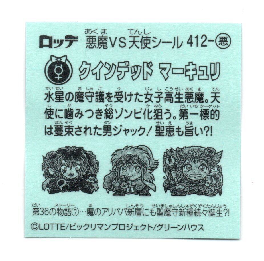 ビックリマン 36弾 「クインデッド マーキュリ」 412-悪 -||- 人気キャラクター「クインデッド マーキュリ」が、36弾シリーズに堂々と登場!その魅惑的なデザインと印象的な表情は、多くのファンを惹きつけています。この一枚をコレクションに加えることで、ビックリマンの新たな楽しみが広がります。 -||- あなたのビックリマンコレクションに特別な輝きを与える「クインデッド マーキュリ」。その独特なアートワークは、コレクター心を強く刺激する逸品です。特別なビックリマンと共に、新たな冒険の旅に出かけましょう! -||- ※シールの保管には十分な注意を払い、湿気や水濡れにご注意ください。